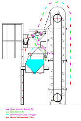 The constituents now in the floor are conveyed to the elevator and in turn the Dynamic Separator. This unit comprises of a primary vibrator sieve and air wash. In this section any remaining dust is taken to the dust collector, spent abrasive and large contaminants to a collection bin. This method of separating spent abrasive, in a way that they are not taken to the dust collector, means that the collector elements are prevented from suffering premature wear. The operator, by adjusting the power of the vacuum placed on the abrasive, decides what minimum size of particle he wishes to remain in the system; i.e. the higher the vacuum the larger the particle taken out of the abrasive.